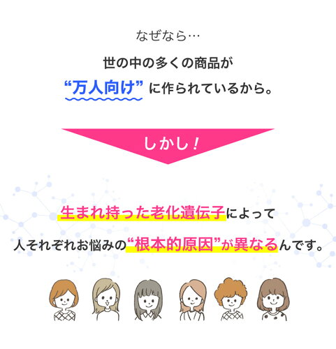 遺伝子博士<エイジングケア>では「糖化」「活性酸素」「過酸化脂質」という代表的な老化原因の遺伝的進みやすさを調べます 自分の遺伝子に合った美容法をする/しないでは、見た目年齢に大きな差が生まれていきます・・・ あなたも今すぐ!話題の肌遺伝子検査で自分の肌/頭皮にぴったりのアンチエイジング法を見つけませんか? サンプルの採取は自宅で簡単。